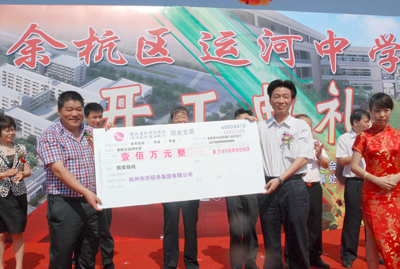 7月3日,烈日炎炎,在運河中學舉行的開工典禮上,東華集團董事長宣碧華熱心參與余杭區運河鎮組織的“捐資助校·功德千秋”慈善捐贈活動,向運河中學建校捐款100萬元,為“運河中學”建設項目添磚加瓦,充分體現了東華集團關心、支持教育事業的拳拳愛心。