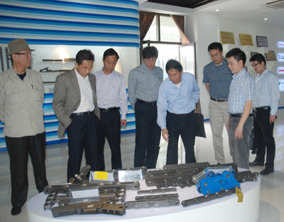 923,浙江省科技咨詢中心副主任陳偉、杭州市科技咨詢中心、杭州市院士專家服務中心主任吳挺等省市區科學技術協會領導陪同寧夏回族自治區科學技術協會副主席王冰等領導到東華集團就院士工作建設情況及取得的成效進行調研。圖為副總經理袁立華、技術中心顧問陳金賢陪同陳主任一行參觀樣品。