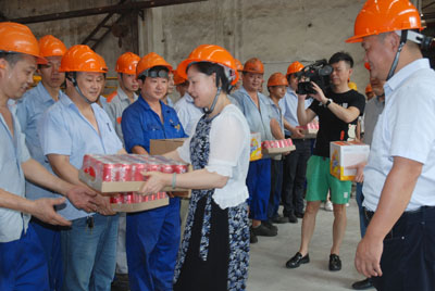 7月24日,公司副總經(jīng)理袁立華、工會(huì)主席魯小林接待了開發(fā)區(qū)管委會(huì)副主席蔣葉華一行對(duì)一線職工的慰問。慰問中,蔣主席等非常關(guān)心公司的降溫措施和員工的身體健康。袁總、魯主席向蔣主席一行匯報(bào)了公司在高溫中采取的措施,生產(chǎn)一線均配備了冷風(fēng)機(jī)、排風(fēng)扇、電風(fēng)扇、消音設(shè)備等,每天向一線員工發(fā)放防暑藥品、礦泉水、棒冰、綠豆湯等,在各車間放置冰塊降溫,確保員工高溫中安全健康。蔣主席一行對(duì)這些措施并取得的成效表示贊同。